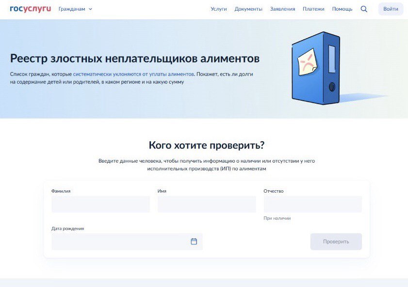 На портале теперь можно узнать, есть ли у гражданина долги по алиментам на содержание детей или родителей и на какую сумму, а также в каком регионе ведётся исполнительное производство.